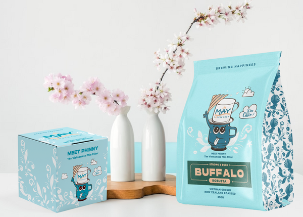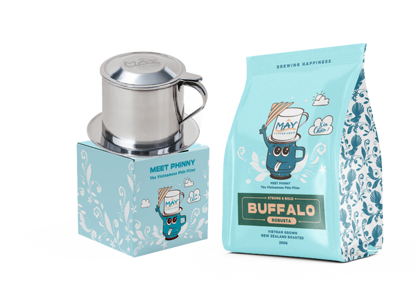 This bundle includes the phin filter of your choice with 250g Buffalo in either Whole Bean or Phin grind.